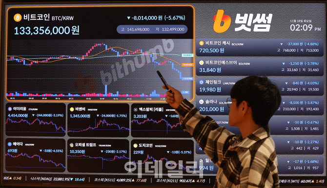 [이데일리 이영훈 기자] 비트코인이 하락을 거듭하며 7개월 만에 9만 달러선이 붕괴한 18일 서울 강남구 빗썸라운지에 설치된 전광판에 비트코인 시세가 나오고 있다.