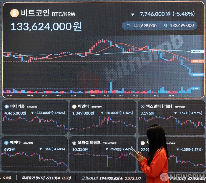 [서울=뉴스핌] 류기찬 기자 = 비트코인이 7개월 만에 9만 달러 선 밑으로 하락한 18일 오후 서울 강남구 빗썸라운지 전광판에 비트코인 시세가 표시되고 있다. 오후 3시 빗썸 기준 1억 3천 3백만원대를 기록하고 있다. 2025.11.18 ryuchan0925@newspim.com