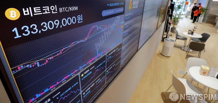 [서울=뉴스핌] 류기찬 기자 = 비트코인이 7개월 만에 9만 달러 선 밑으로 하락한 18일 오후 서울 강남구 빗썸라운지 전광판에 비트코인 시세가 표시되고 있다. 오후 3시 빗썸 기준 1억 3천 3백만원대를 기록하고 있다. 2025.11.18 ryuchan0925@newspim.com