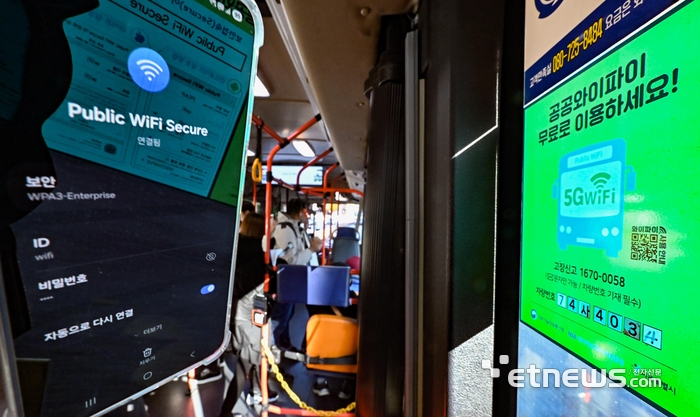 정부가 2026년 약 20% 감축한 버스 와이파이 예산을 국회에 제출한 것으로 알려진 가운데 예산 감축으로 9000여 개의 버스 와이파이가 운영 중단될 위기에 놓였다. 18일 서울 시내에서 운행중인 시내버스에 공공와이파이 사용 안내문이 붙어 있다.