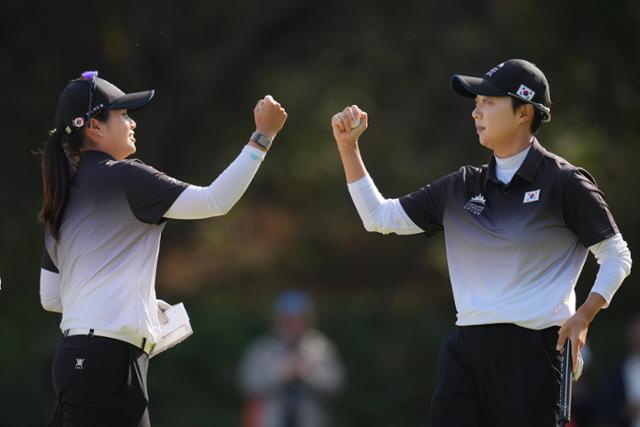김효주(오른쪽)와 최혜진이 지난달 25일 경기 고양시 뉴코리아 컨트리클럽에서 열린 LPGA 투어 한화 라이프플러스 인터내셔널 크라운에서 하이파이브를 하고 있다. AP 연합뉴스 |