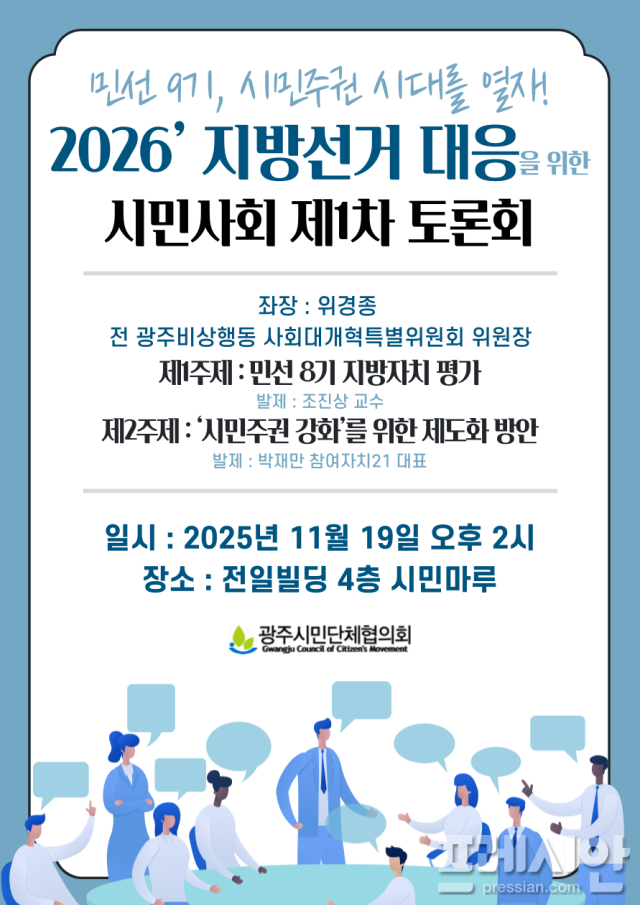 주요 논의 주제는 ▲민선 8기 지방자치 평가 ▲시민주권 제도화 방안 ▲정치 다양성 확대를 위한 선거제도 개선 ▲시민 주도 광주발전 의제 형성 방안 등이다.