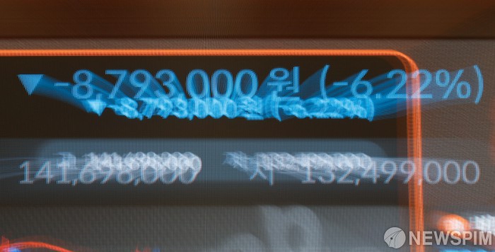 [서울=뉴스핌] 류기찬 기자 = 비트코인이 7개월 만에 9만 달러 선 밑으로 하락한 18일 오후 서울 강남구 빗썸라운지 전광판에 비트코인 시세가 표시되고 있다. 오후 3시 50분 빗썸 기준 1억 3천 2백만원대를 기록하고 있다. 2025.11.18 ryuchan0925@newspim.com |