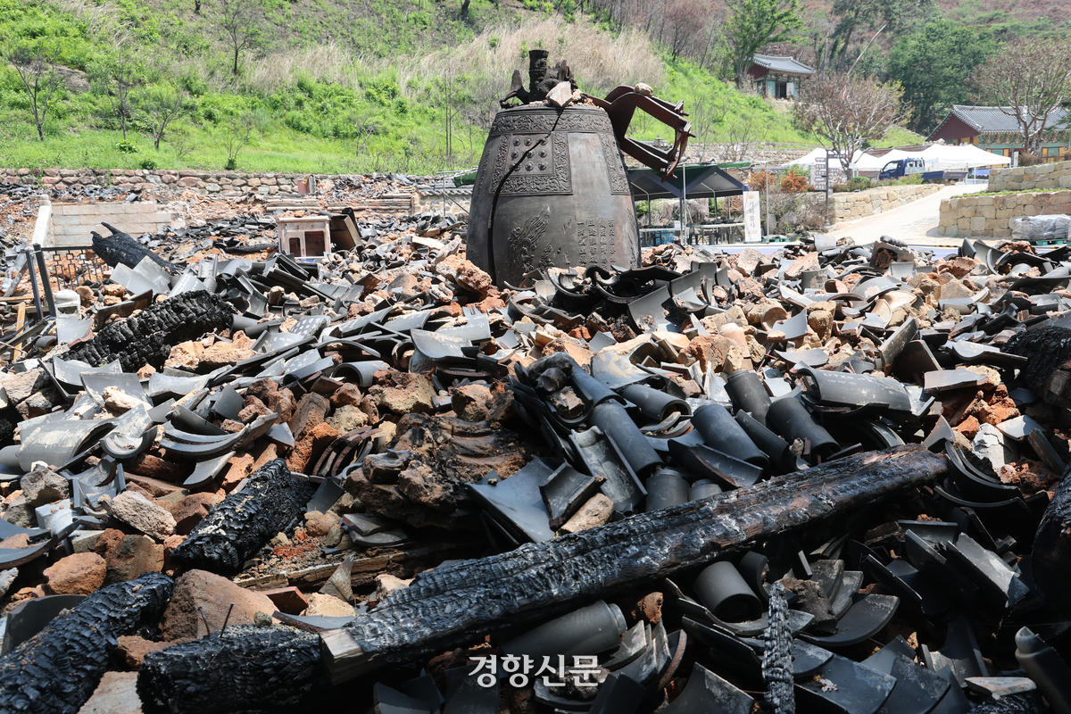 대형 산불로 전소된 경북 의성군 고운사 경내에 불에 타지 않은 범종과 기왓장들이 널브러져 있다. 정지윤 선임기자 |