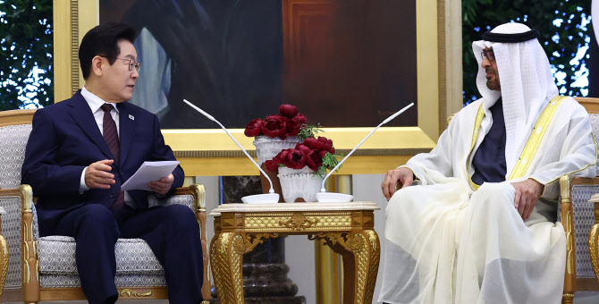 아랍에미리트(UAE)를 국빈 방문 중인 이재명 대통령이 18일(현지시간) 아부다비 대통령궁에서 무함마드 빈 자이드 알 나흐얀 UAE 대통령과 한-UAE 확대회담을 하고 있다.(사진=연합뉴스) |