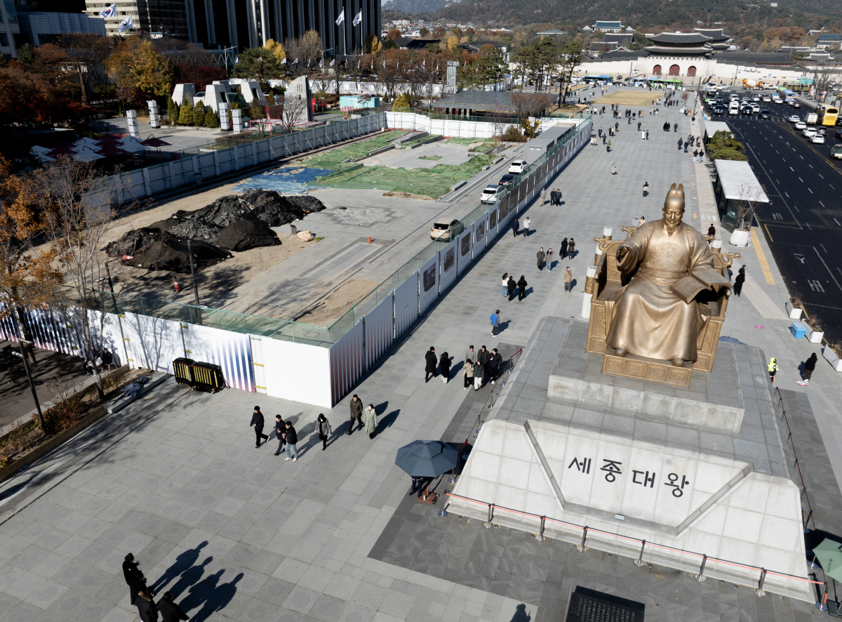 시민 60% 반대에도…세종대왕 옆 ‘받들어총’ 세우나 18일 서울 광화문광장 세종대왕상 왼편으로 6·25 참전용사를 기리는 조형물인 ‘받들어총’이 조성된 ‘감사의 정원’ 공사 현장이 보인다. 연합뉴스 |