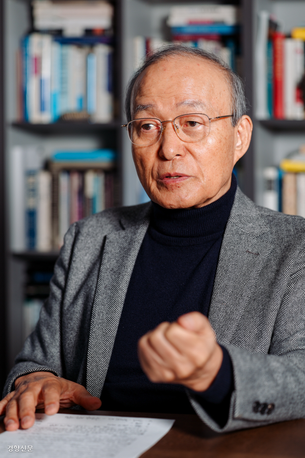 송민순 전 외교통상부 장관이 지난 14일 서울 용산구 소월로 연구실에서 인터뷰하고 있다. 그는 신간 <좋은 담장 좋은 이웃>에 대해 “국민들 사이에 공감의 창을 넓히는 데 벽돌 하나라도 놓았으면 좋겠다”고 했다. 이준헌 기자 heon@kyunghyang.com |