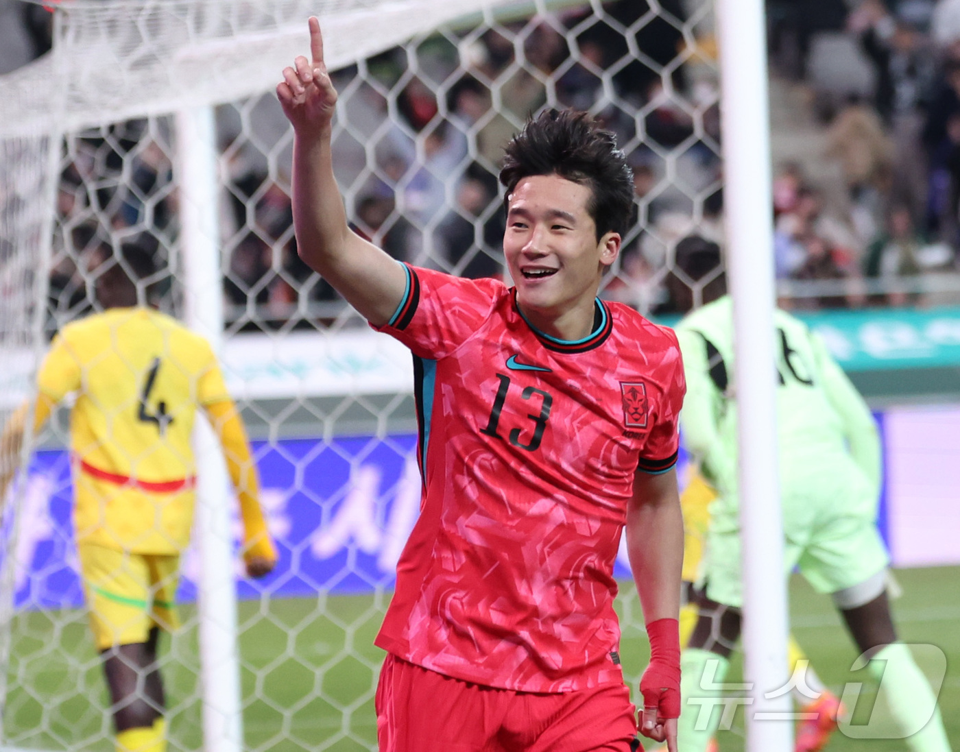 18일 오후 서울 마포구 서울월드컵경기장에서 열린 ‘하나은행 초청 국가대표팀 친선경기’ 대한민국과 가나와의 경기에서 후반 이태석이 헤더 선제골을 넣고 세리머니하고 있다. 2025.11.18/뉴스1 ⓒ News1 박지혜 기자 |