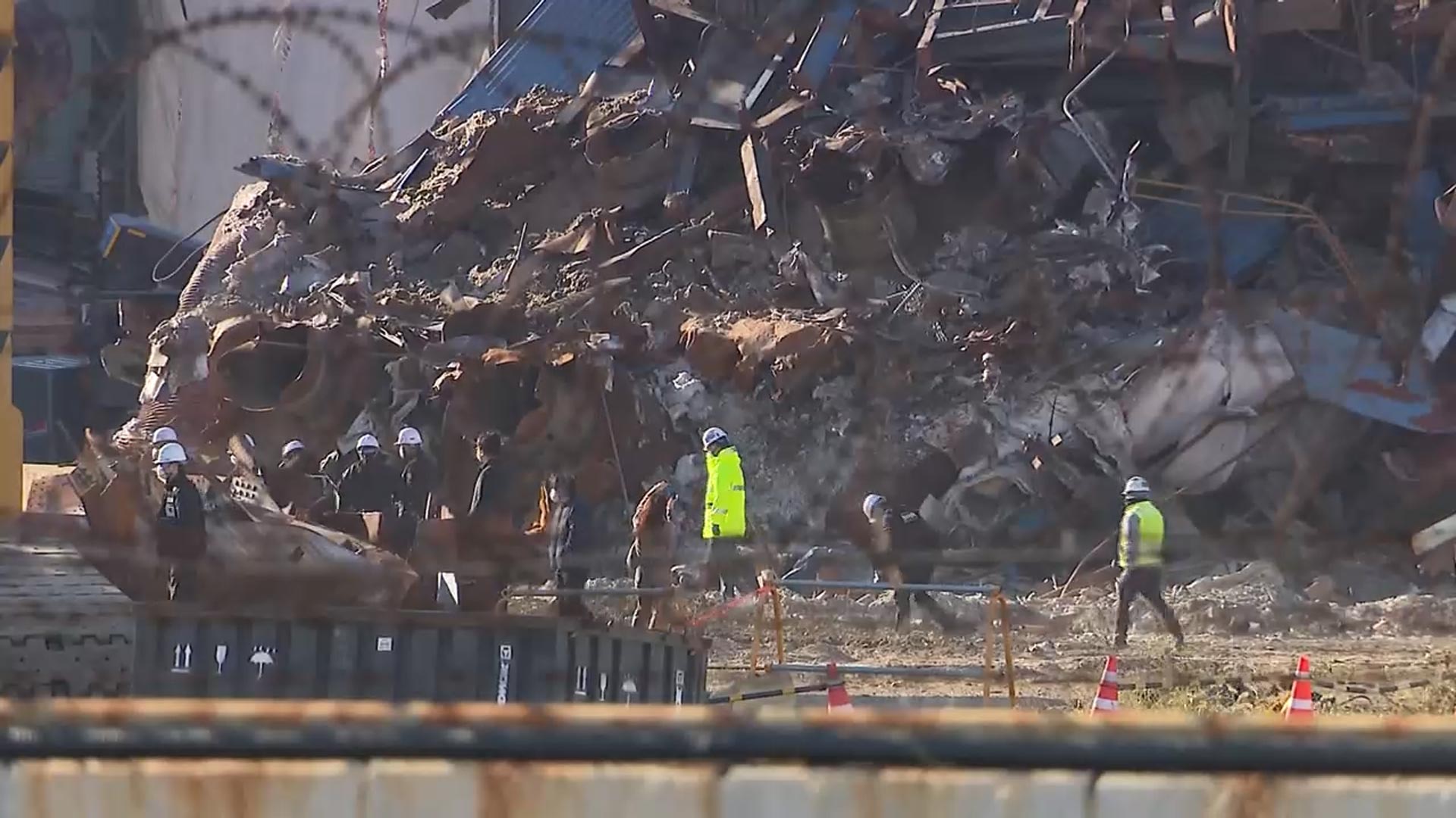 구조물은 대각선 방향으로 주저앉은 채 붕괴됐고, 아래에는 찌그러지고 휜 잔해가 뒤엉켜 있습니다.