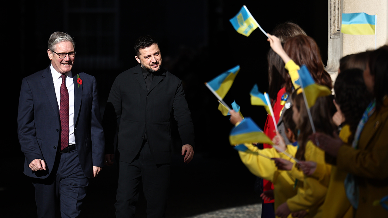 ▲ 24일 영국 런던에서 열린 회의에 참석하기 위해 도착한 젤렌스키 대통령이 (오른쪽) 우크라이나 초등학생들의 환영을 받고 있다.