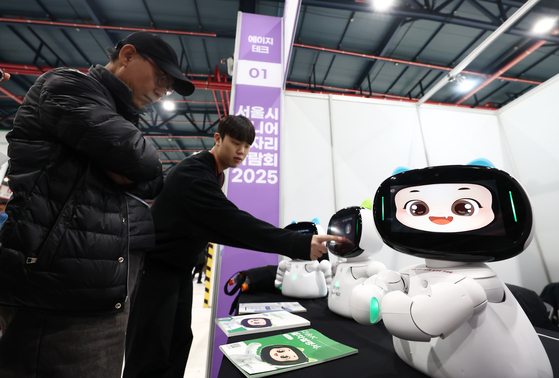 18일 서울 강남구 세텍에서 열린 서울시 시니어 일자리박람회를 찾은 방문객이 돌봄로봇 다솜K와 대화하고 있다. [뉴스1]
