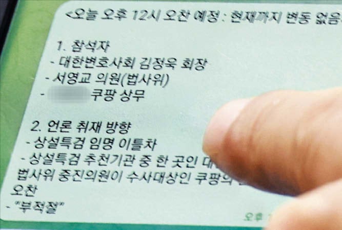 이날 오찬은 ‘관봉권 띠지 폐기 의혹 및 쿠팡 퇴직금 불기소 외압 의혹’을 수사하는 상설특검이 출범한 다음 날 이뤄졌다. 상설특검을 추진해온 여당 법사위원과 특검 후보 추천위원인 변협회장, 특검 수사 대상인 쿠팡 임원이 한자리에 모인 것이다. 상설특검은 올해 4월 인천지검 부천지청이 수사한 일용직 노동자 퇴직금 미지급 사건을 당시 엄희준 부천지청장이 수사팀에 압력을 넣어 불기소하도록 했다는 의혹을 수사한다. 당시 수사 책임자였던 문지석 부장검사가 국회 국정감사에서 외압을 폭로해 사건이 공론화됐다.