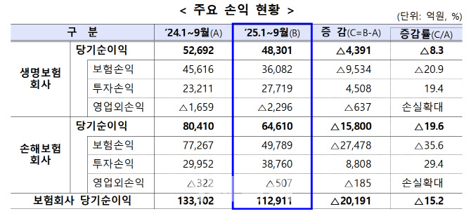 19일 금융감독원에 따르면 2025년 1~9월 생명보험·손해보험 전체 보험회사 53곳의 당기순이익은 11조2,911억원으로 전년 동기 대비 2조191억원 줄어든 것으로 집계됐다. 감소율은 15.2%다.