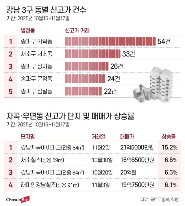 법정동별로 보면 송파구 가락동(54건), 서초구 서초동(33건), 송파구 장지동(26건)에서 신고가 거래가 많았다. 또 송파구 문정동(24건)과 잠실동(22건)에서도 20건 넘는 신고가 계약이 체결됐다.
