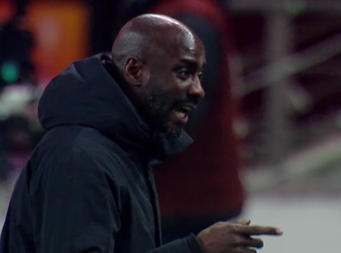 오토 아도 가나 감독이 18일 서울월드컵경기장에서 열린 한국과의 평가전에서 선수들에게 작전을 지시하고 있다. [사진=쿠팡플레이 중계화면 캡처]