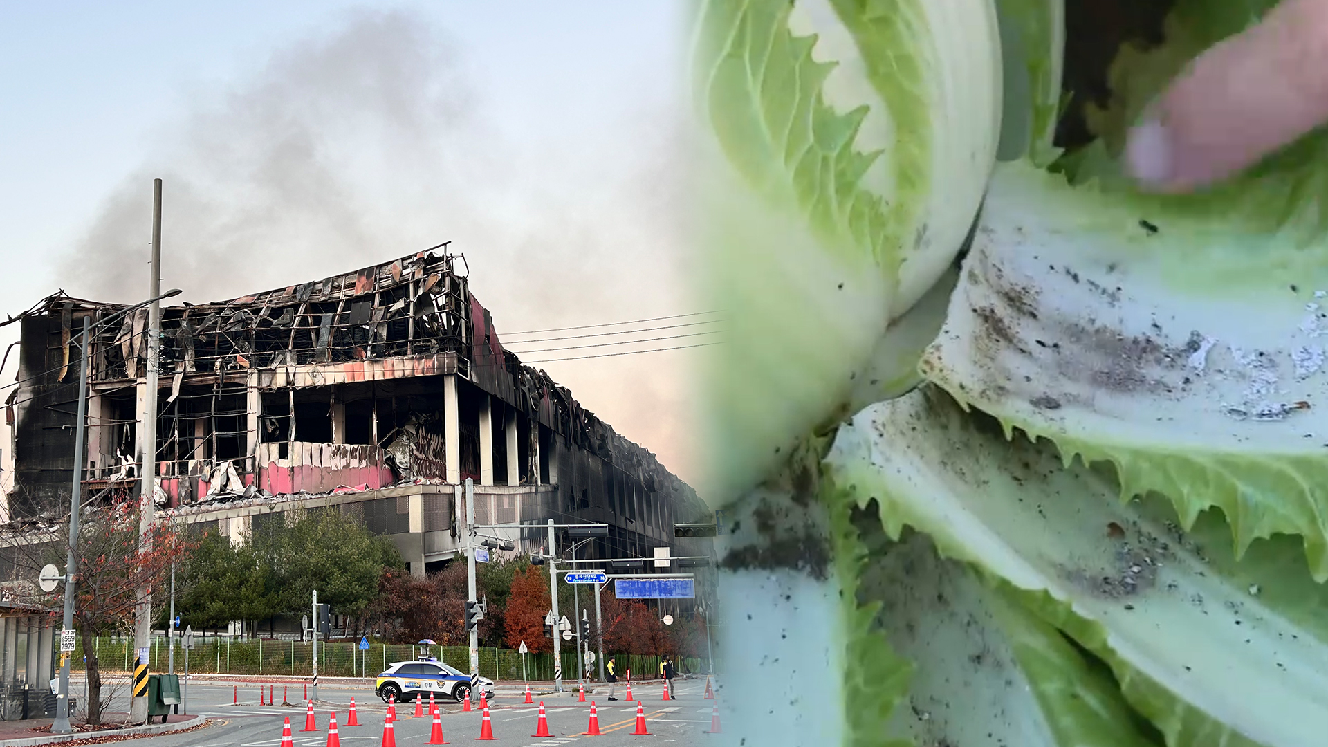 화재 당시 날아온 분진과 단열재 등 각종 잔재물이 배추 곳곳에 남아 있습니다.