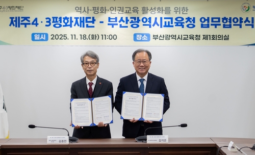 (부산=연합뉴스) 조정호 기자 = 부산시교육청은 지난 18일 오전 교육청 회의실에서 올바른 역사관을 함양하고 평화·인권의 가치를 확산하기 위해 제주4·3평화재단과 '역사·평화·인권교육 활성화를 위한 업무협약'을 체결했다고 19일 밝혔다.