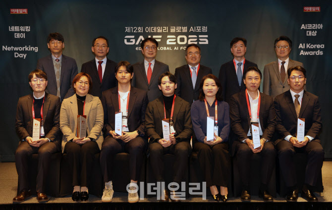 [이데일리 노진환 기자] 2025 이데일리 AI 코리아 대상 시상식이 18일 서울 더플라자 호텔에서 열렸다. 이익원(뒷줄 왼쪽 세 번째) 이데일리 대표와 내빈들, 각 부문 수상자들이 기념촬영을 하고 있다. 뒷줄 왼쪽부터 김경만 과학기술정보통신부 인공지능정책실장, 박동일 산업통상부 산업정책실장, 이익원 이데일리 대표, 양승현 한국인공지능산업협회장, 박용순 중소벤처기업부 중소기업정책실장, 이상구 심사위원장.앞줄 왼쪽부터 이진수 셀렉트스타 COO, 김득화 펀진 대표이사, 양정모 라이너 COS, 정진우 트웰브랩스 사업개발이사, 박정현 인터엑스 CIO, 박용훈 엘리스그룹 사업총괄, 신기영 플리토 CSO. |
