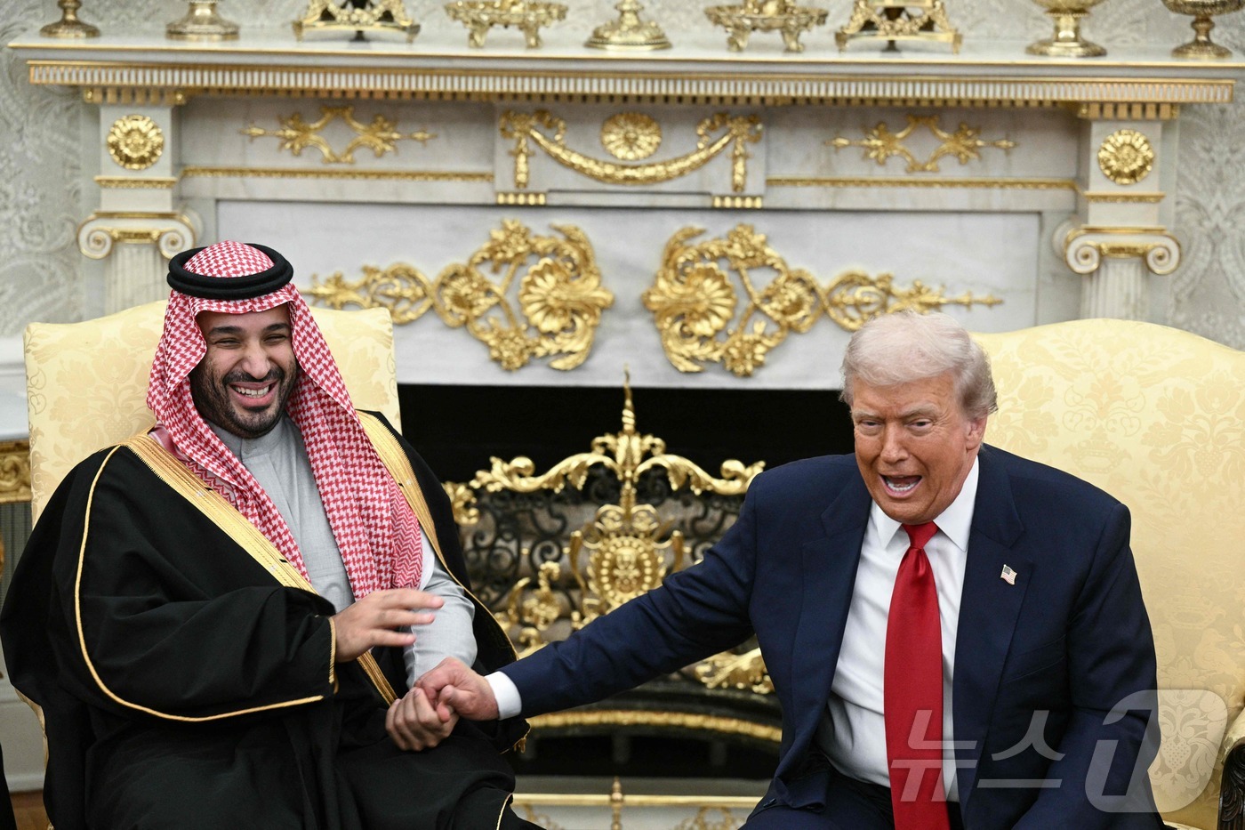 18일(현지시간) 도널드 트럼프 미국 대통령이 워싱턴 D.C. 백악관 집무실에서 사우디아라비아 왕세자 무함마드 빈 살만과 회동하며 악수와 주먹 인사를 농담 섞어 주고받았다. 사우디 왕세자는 이날 화려한 의전과 전투기 호위 속에 백악관에 도착했으며, 이는 2018년 언론인 자말 카슈끄지 피살 사건 이후 처음으로 미국을 방문한 자리였다. ⓒ AFP=뉴스1 |
