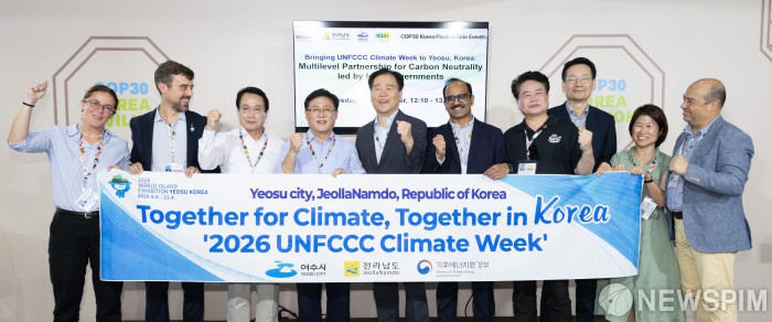 [서울=뉴스핌] 김성환 기후에너지환경부 장관이 18일(현지시간) 브라질 벨렝에서 열린 2026 유엔기후주간 유치 행사에 참석해 관계자들과 기념촬영을 하고 있다. [사진=기후에너지환경부] 2025.11.19 photo@newspim.com