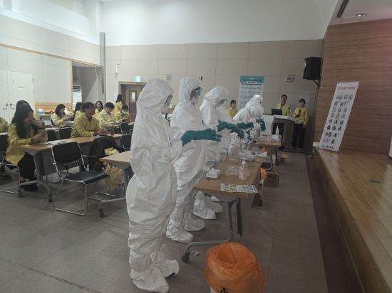 교육 후 진행된 모의훈련에서는 Level-D 개인 보호복 착·탈의 실습을 통해 오염 방지 절차를 반복 숙달하고, 현장에서의 안전성과 감염 차단 능력을 강화했다.