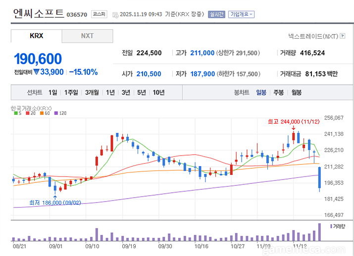 19일 9시 43분 기준 유가증권시장에서 엔씨소프트는 전일 대비 3만 3,900원(15%) 내린 19만 600원에 거래되고 있다. 이와 같은 하락세는 게임을 출시하면 주가가 하락하는 국내 게임 업계 특성에도 불구하고 큰 폭이다.