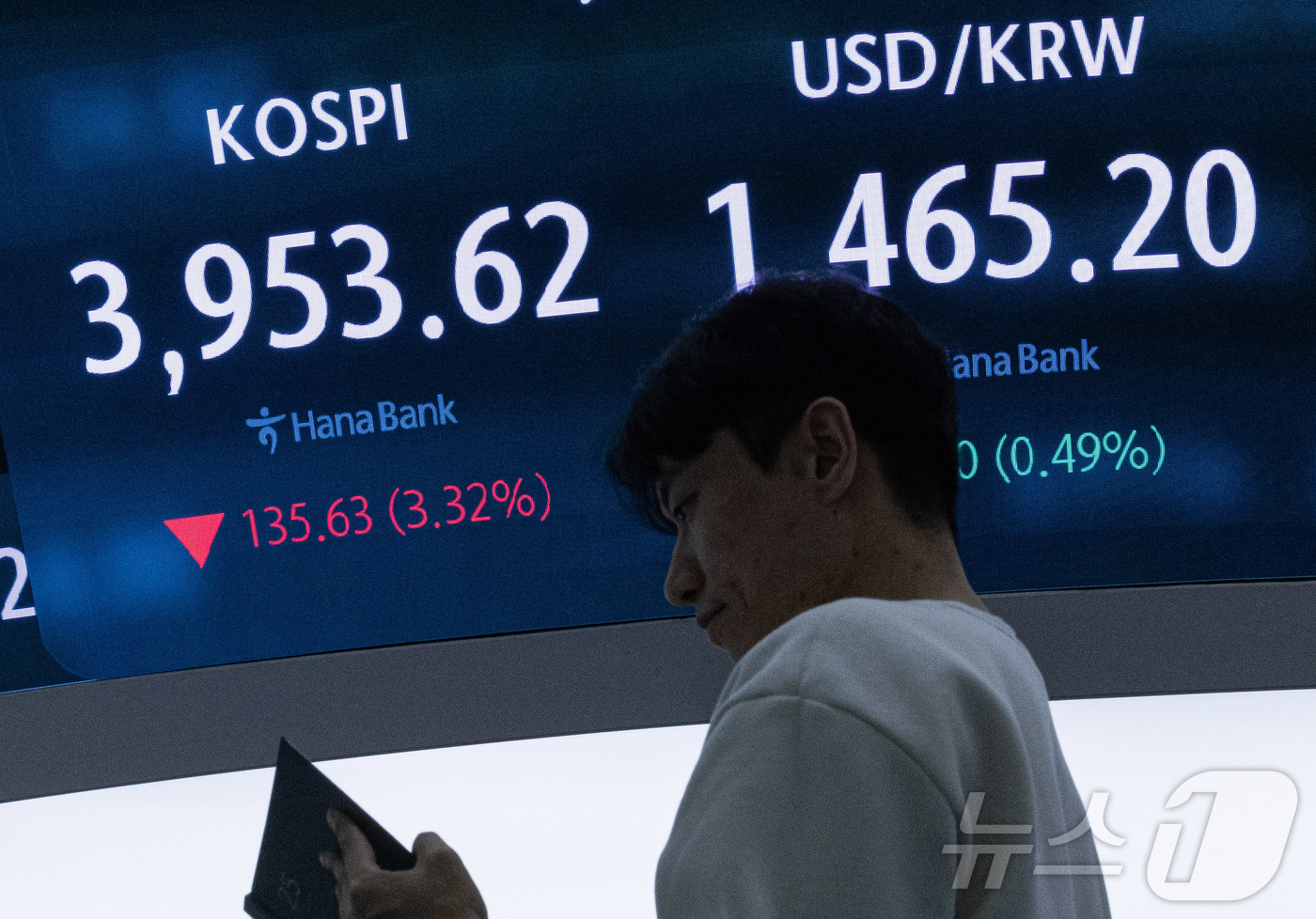 18일 오후 서울 중구 하나은행 본점 딜링룸 전광판에 증시 종가가 표시되고 있다. 이날 코스피 지수는 전 거래일 대비 135.63p(3.32%) 하락한 3,953.62, 코스닥 지수는 23.97p(2.66%) 내린 878.70으로 장을 마감했다. 2025.11.18/뉴스1 ⓒ News1 이재명 기자 |