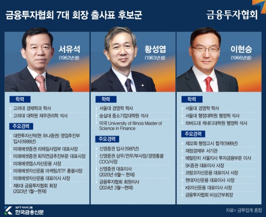 서유석 현 금투협회장이 연임 도전에 나섰고, 황성엽 현 신영증권 대표이사와 이현승 전 SK증권·KB자산운용 대표이사가 일찍이 출사표를 냈다.