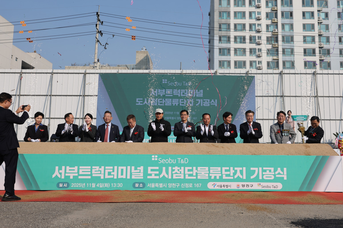 오세훈 서울시장이 4일 서울 양천구 서부트럭터미널에서 열린 '도시첨단물류단지 기공식'에서 참석자들과 기념촬영을 하고 있다. |