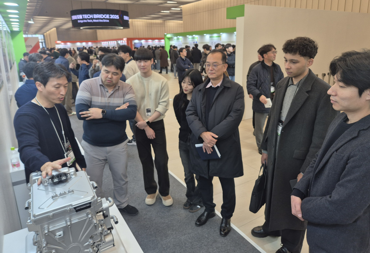 경기도 의왕 현대모비스 기술연구소에서 진행된 ‘Tech Bridge 2025’에서 50개 전동화·모듈 신기술 전시 현장과 첨단 기술을 체험하는 관람객들의 모습 |