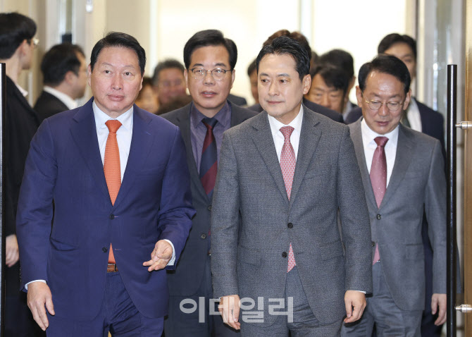 [이데일리 김태형 기자] 장동혁(오른쪽) 국민의힘 대표와 최태원(왼쪽) 대한상공회의소 회장 등이 19일 서울 중구 대한상공회의소에서 열린 '국민의힘-대한상공회의소 정책간담회'에 참석하고 있다.