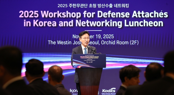장성길 코트라 방산물자교역지원센터(KODITS) 센터장이 19일 서울 웨스틴조선호텔에서 열린 '2025 주한무관단 초청 방산수출 네트워킹' 행사에서 개회사를 하고 있다. [사진=KOTRA] 2025.11.19 dream@newspim.com |