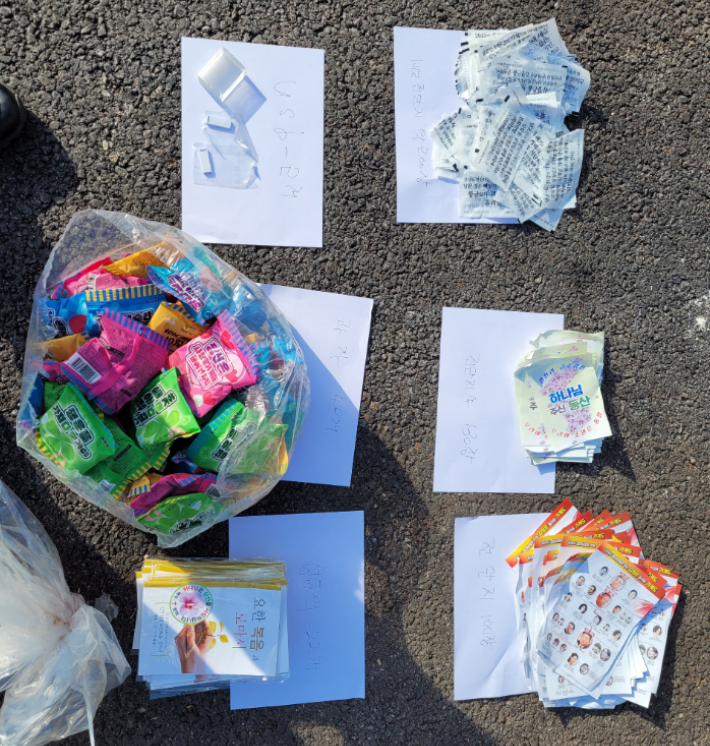 북한 정권을 비난하는 전단과 과자, 성경책, USB 등 압수물. 경기북부경찰청 제공 |