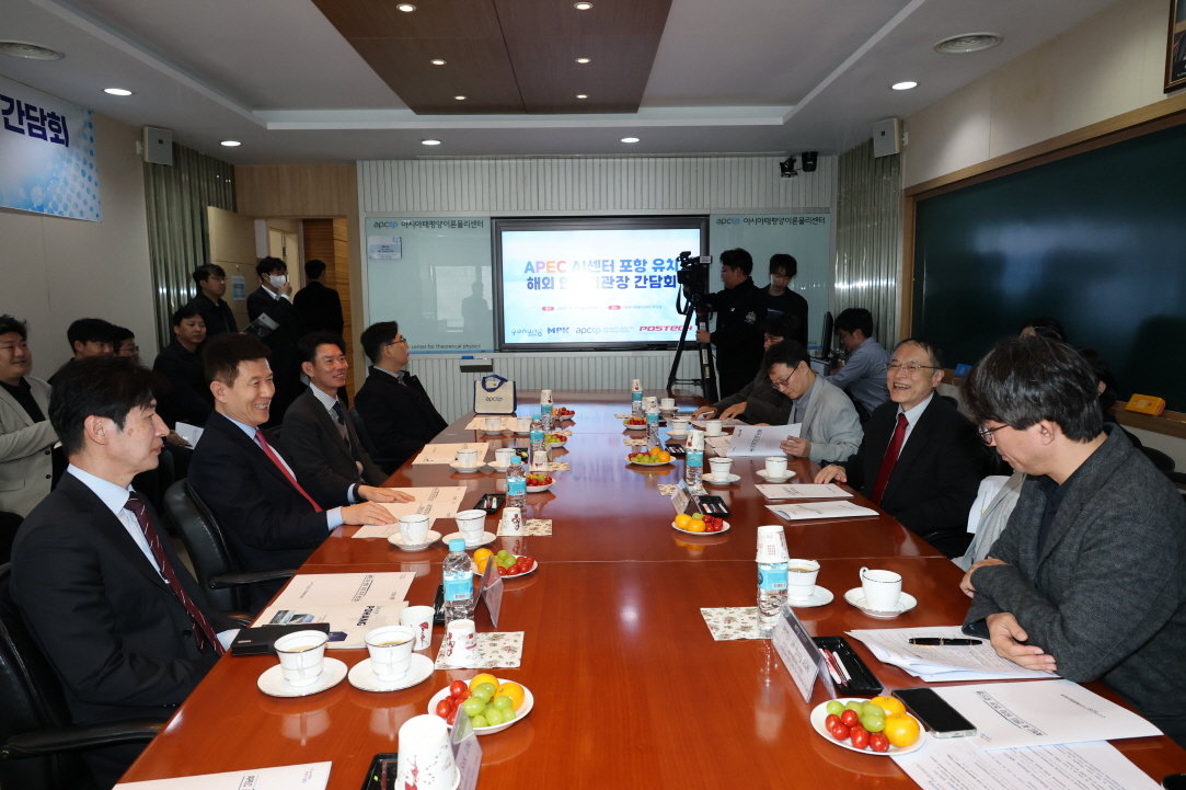 포항시는 17일 남구 아태이론물리센터 회의실에서 ‘APEC AI 센터 포항 유치 해외 연구기관장 간담회’를 갖고 주요 연구기관장들과 아시아·태평양 AI 센터 유치 방안을 논의했다. 간담회에는 사사키 미사오 아태이론물리센터 소장, 박재훈 막스플랑크 한국·포스텍연구소장, 박수진 포스텍 연구처장, 유환조 인공지능연구원 부원장 등이 참석해 공동 협력과 지원 의지를 확인했다.
