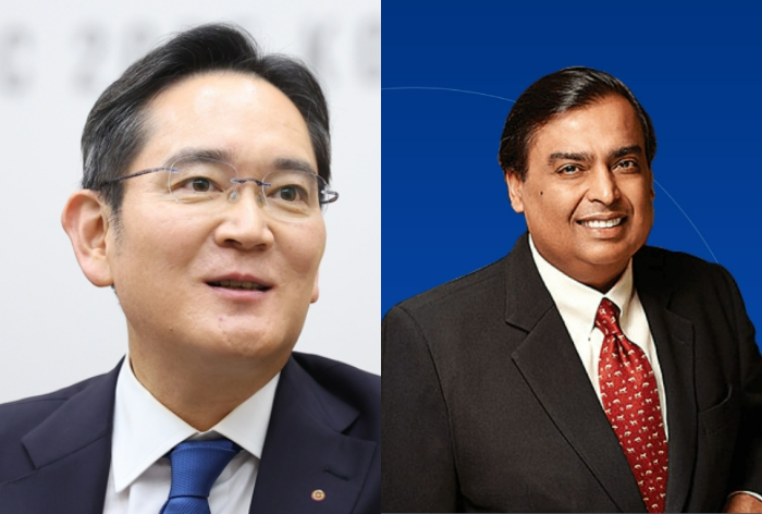 이재용 삼성전자 회장(왼쪽)과 무케시 암바니 릴라이언스그룹 회장 |