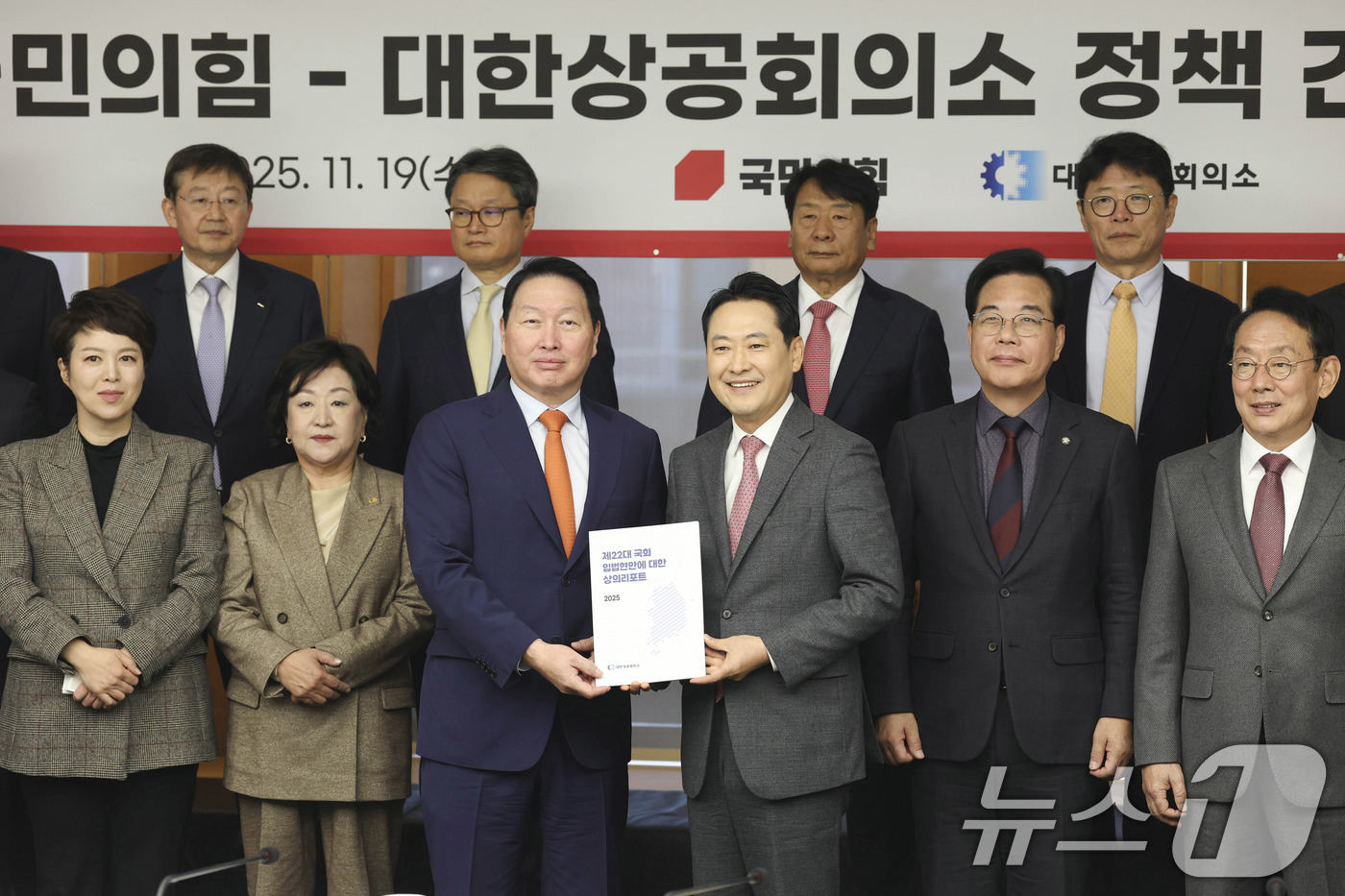 (서울=뉴스1) 박지혜 기자 = 최태원 대한상공회의소 회장이 19일 서울 중구 대한상공회의소에서 열린 '국민의힘-대한상공회의소 정책간담회'에서 장동혁 국민의힘 대표에게 정책제안서를 전달하고 있다. (공동취재) 2025.11.19/뉴스1