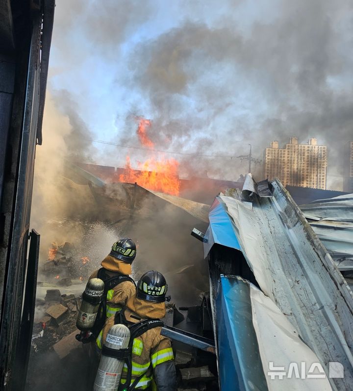 [대구=뉴시스] 이상제 기자 = 대구 달성군의 한 봉제 제조공장에서 화재가 발생해 소방당국이 진화 중이다.