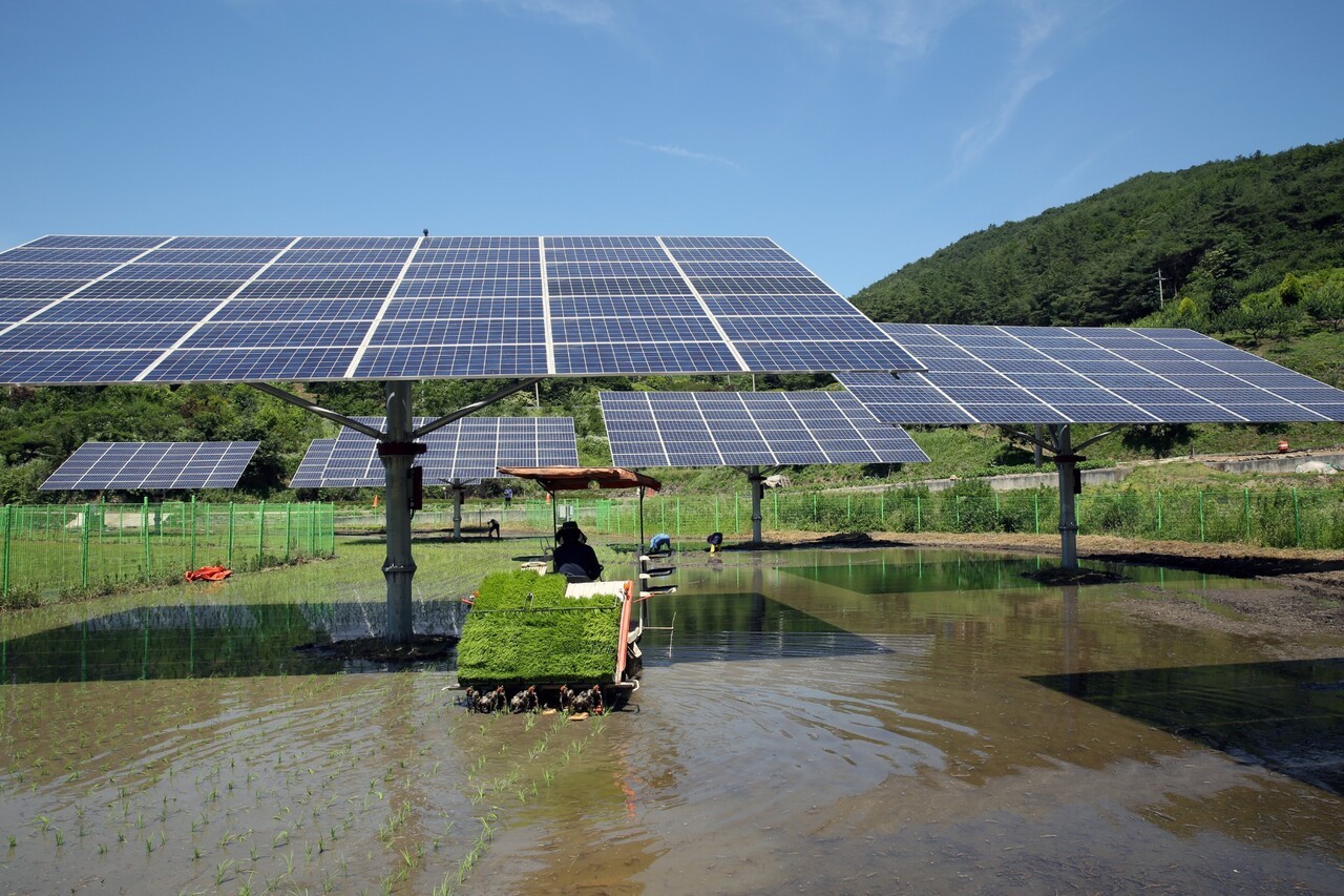 영농형 태양광은 농지 활용도를 유지하면서 전력을 생산할 수 있어 재생에너지 보급 확대의 대안으로 주목받고 있다. 사진은 패널 아래에서 모내기가 진행되는 모습. 정부는 이러한 복합형 발전 모델 확대를 위해 관련 규제 완화와 제도 개선을 추진하고 있다. (사진=파루솔라) |