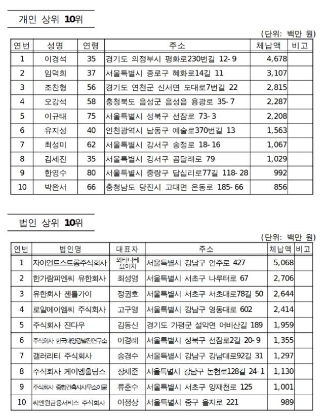 They are 1,078 individuals with a combined 73.6 billion won in unpaid taxes and 499 companies with 49.6 billion won in outstanding liabilities. Most delinquents have outstanding taxes between 10 million and 30 million won, while 201 failed to pay over 100 million won.