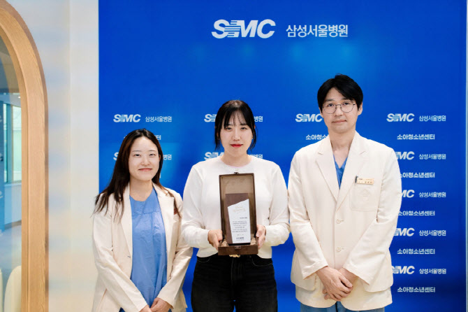 나주영(가운데) 앳홈 미닉스 BO가 삼성서울병원 소아청소년센터에서 진행된 기부금 전달식에 참여해 기념 촬영을 하고 있다. (사진=앳홈) |