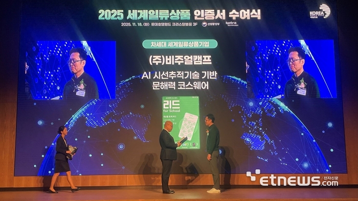 인공지능(AI) 기반 시선추적기술 기업 비주얼캠프(대표 석윤찬)가 시선추적기술이 탑재된 문해력 진단 및 문해력 향상 코스웨어 '리드포스쿨' 제품이 차세대 세계일류상품으로 선정돼 18일 인증서를 수여받았다고 밝혔다.