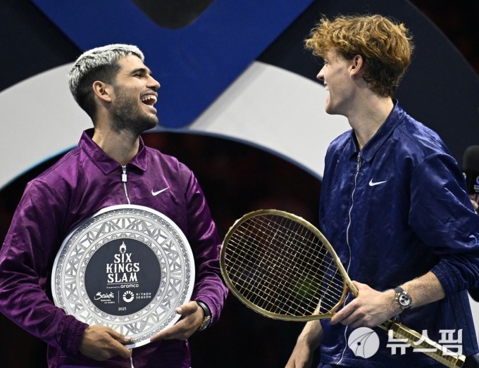 [리야드=뉴스핌] 박상욱 기자= 알카라스(왼쪽)와 시네르가 18일(현지시간) 열린 식스 킹스 슬램 시상식에서이야기를 주고받다 웃음을 터뜨리고 있다. 2025.10.18 psoq1337@newspim.com |