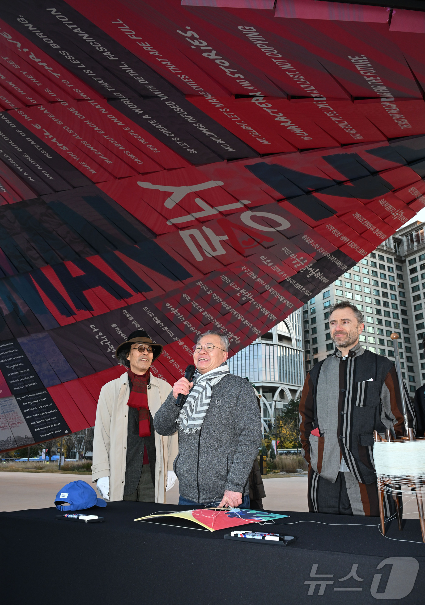 (서울=뉴스1) = 리기태 명장(한국연협회·리기태연보존회 회장)이 17일 서울 종로구 열린송현 녹지광장에서 열린 '제5회 서울도시건축비엔날레' 폐막식에서 비엔날레 총감독을 맡은 세계적인 디자이너 토마스 헤더윅과 폐막식을 장식하는 방패연 날리기에 앞서 인사말을 하고 있다. (한국연협회 제공. 재판매 및 DB 금지) 2025.11.19/뉴스1