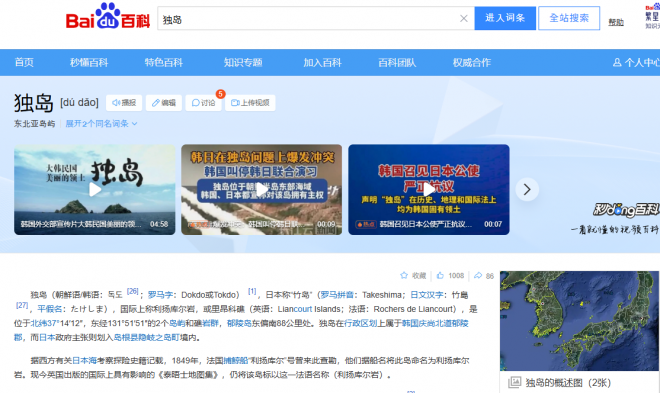 19일 오전 10시 기준 중국 대표 포털사이트인 ‘바이두’의 백과사전에서 ‘독도’를 검색하면 “울릉도에서 동남쪽으로 88km 떨어진 두 개의 섬과 암초로 이루어진 군도이며 행정적으로 대한민국 경상북도 울릉군에 속하지만 일본 정부는 시네마현에 속한다고 주장한다”는 내용이 검색된다.