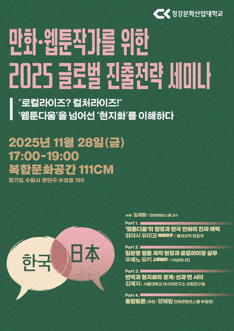 청강문화산업대학교(총장 최성신)는 11월 28일(금) 오후 5시부터 7시까지 수원 복합문화공간 111CM에서 '2025 만화·웹툰 작가를 위한 글로벌 진출 전략 세미나'를 개최한다고 밝혔다.