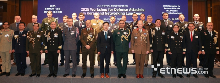 19일 서울 웨스틴조선호텔에서 열린 '2025 주한무관단 초청 방산수출 네트워킹' 행사에서 장성길 KOTRA 방산물자교역지원센터(KODITS) 센터장(앞줄 왼쪽에서 일곱 번째)과 행사에 참가한 국방무관들이 기념촬영을 하고 있다. KOTRA 제공 |
