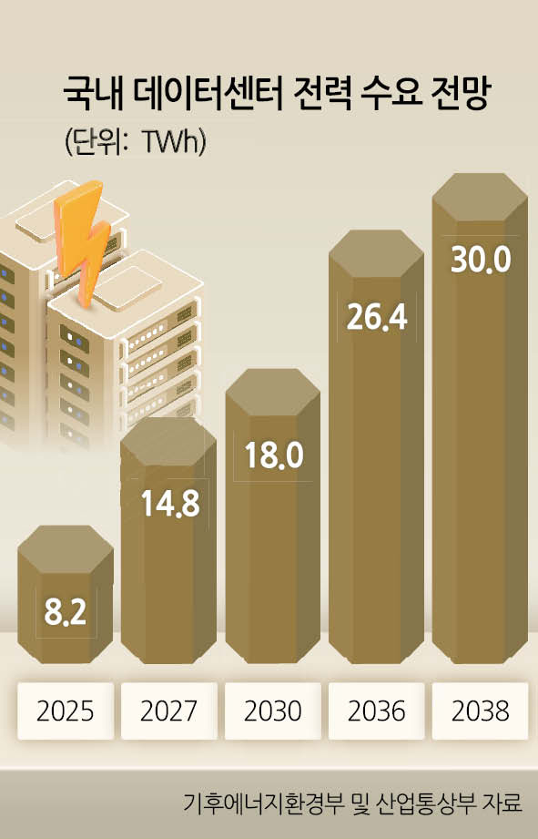 기후부 등에 따르면 국내 데이터센터 전력 수요는 올해 8.2TWh에서 2038년 30.0TWh로 약 4배 늘어날 것으로 전망된다.