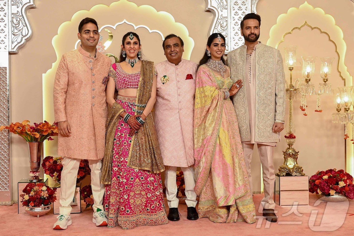 아시아 최고갑부 무케시 암바니 인도 릴라이언스 인더스트리 회장이 12일 뭄바이에서 시작된 막내아들 아난트 암바니의 결혼식에서 장남 아카시 부부(왼쪽), 장녀 이샤 부부(오른쪽)와 가족 사진을 찍고 있다. 3일간 이어지는 초호화판 암바니가(家) '세기의 결혼식'은 장 녀, 장남에 이어 이번이 3번째이다. 2024.07.12 ⓒ AFP=뉴스1 ⓒ News1 이강기자 |