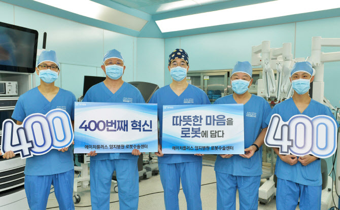 로봇수술 도입 1년 6개월 만에 ‘다빈치 로봇수술’ 400례를 달성한 에이치플러스 양지병원 로봇수술센터 의료진. |