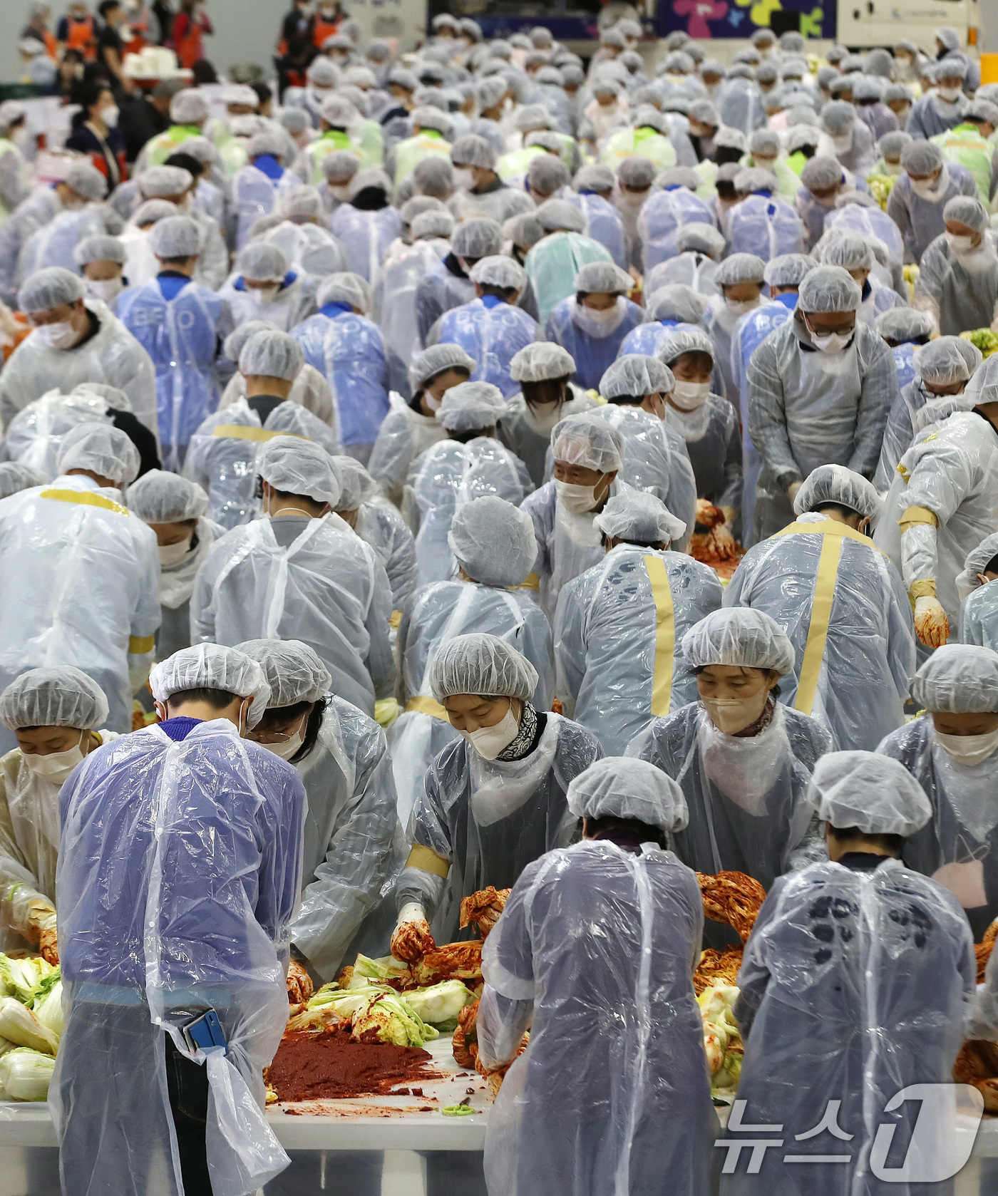 (부산=뉴스1) 윤일지 기자 = 19일 부산 해운대구 벡스코 제2전시장에서 열린 '2025 사랑의 김치나눔 한마당'에서 자원봉사자들이 김장을 하고 있다. 후원 기업·기관 임직원, 자원봉사자 등 1000여 명이 정성스레 담근 김장김치 1만여 포기는 부산지역 독거노인 가정 등 6200여 세대에 가구당 5㎏씩 전달된다. 2025.11.19/뉴스1